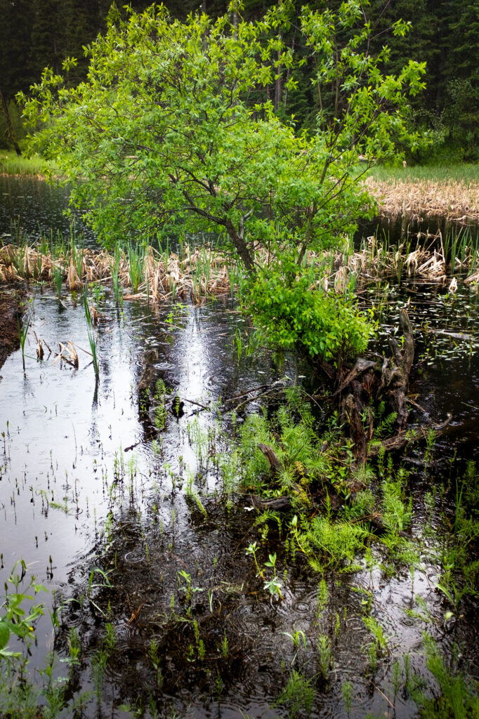 I arrive in McCall greeted by unseasonably cool and wet weather and meet the Camp Director. He apologizes for an empty camp and the rain, both not ideal for our reason for being here. The empty camp was expected because of COVID. The weather, which started as a dry and hot spring has turned into a wetter and cooler one. It is decided to make the most of it by taking a few photos around camp then making our way to the marsh. After hiking a ways in the marsh, the rain is coming down harder and I find a place to rest in the company of a large boulder poking through the brush and a single stem of small yellow flowers.