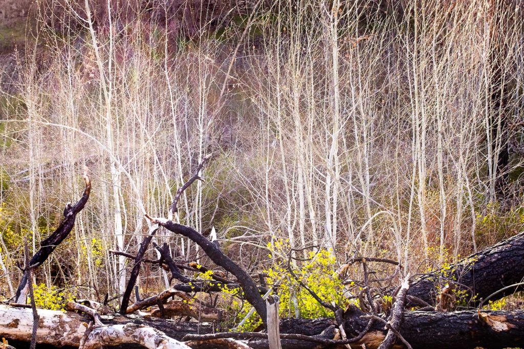 We found our way to a viewpoint over the lake. Ducks and waterfowl floated on wind swept waves. Others soared overhead with motionless wings carried by the wind. As we began our return along the lake, within the burned areas, we passed a number of young aspen groves.